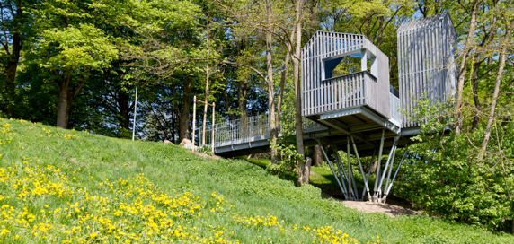 Eine barrierefreie Plattform mit drei Einzelhäusern lädt zum Verweilen in den Baumkronen ein und bietet differenzierte