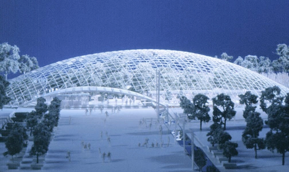Der Entwurf orientiert sich an der Hügelschaft des Bornstädter Feldes. Die Biosphäre bildet in ihrer Lage und Form den Übergang zwischen der Parklandschaft und der städtischen Esplanade, wobei sich die Form ganz klar von