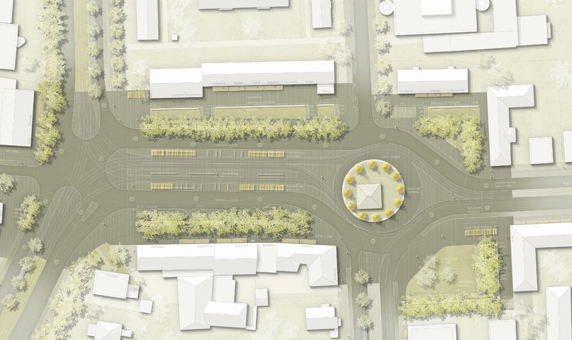 Die Orte der Haltestellen werden durch ein Raster aus Metallbügeln gefasst und räumlich definiert, in den die Funktionen der Haltestellen wie Fahrkartenautomat, Sitzbänke und Anzeigeelemente ebenso integriert sind, wie Funktions- und Effektbeleuchtungen der Flächen. Die Bügel bilden durch den messing-goldenen Farbton eine zusammenhängende und ortbildprägende Einheit – farblich werden dabei bewusst Elemente und Stimmungen aus der nahe gelegene Schlossanlage transferiert.
