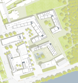 Der dem Grünzug zugeordnete „Landplatz“ lässt ein „Hereinwachsen“ der Vegetation zu und enthält Aufenthalts- und Bewegungsmöglichkeiten für die Studenten. Der „Flussplatz“ bietet von seinem angehobenen Standort einen weiten Blick über das Wasser.